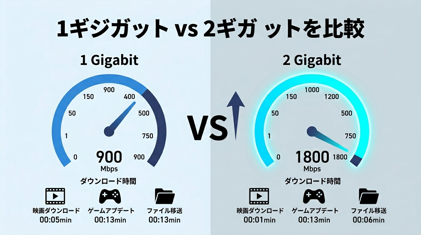 この表から読み取れるのは、下り速度において2ギガプランは1ギガプランのおよそ1.5〜2倍のパフォーマンスが出やすいということです。ただし上り速度に関しては、2ギガプランのGPON方式では上限が1Gbpsであるため、NTT系1ギガプランの上り実測と大きな差が出ない場合もあります。クラウドストレージへの大容量アップロードや動画配信を頻繁に行う場合は、上り速度も必ず確認しておきましょう。