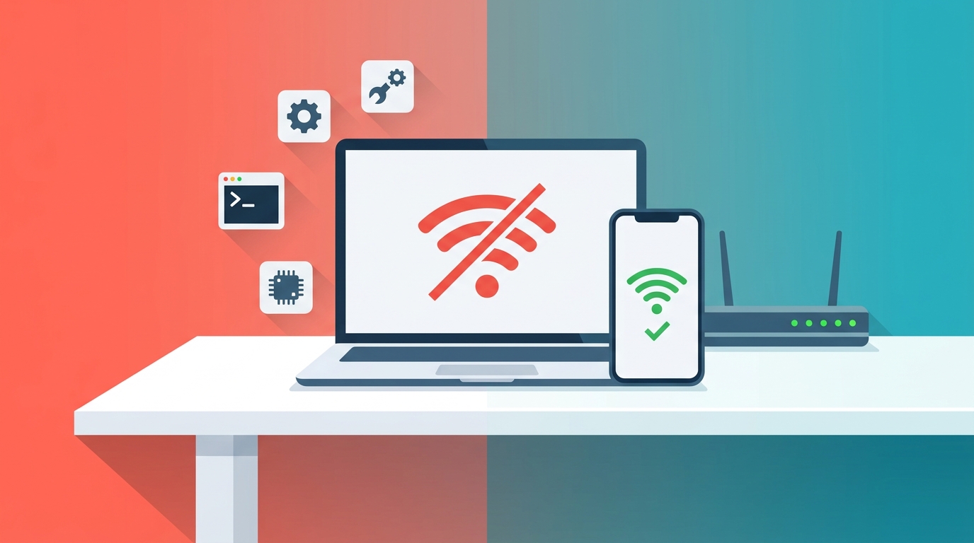 対処法に入る前に、原因が本当にパソコン側にあるのかを確認しましょう。切り分けの方法は非常に簡単です。スマホやタブレットなど別のデバイスで同じSSID(Wi‑Fi名)に接続してみるだけで判別できます。
